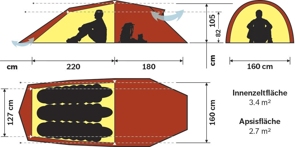 Maße Innenzelt: LxBxH 220x160x105 cm