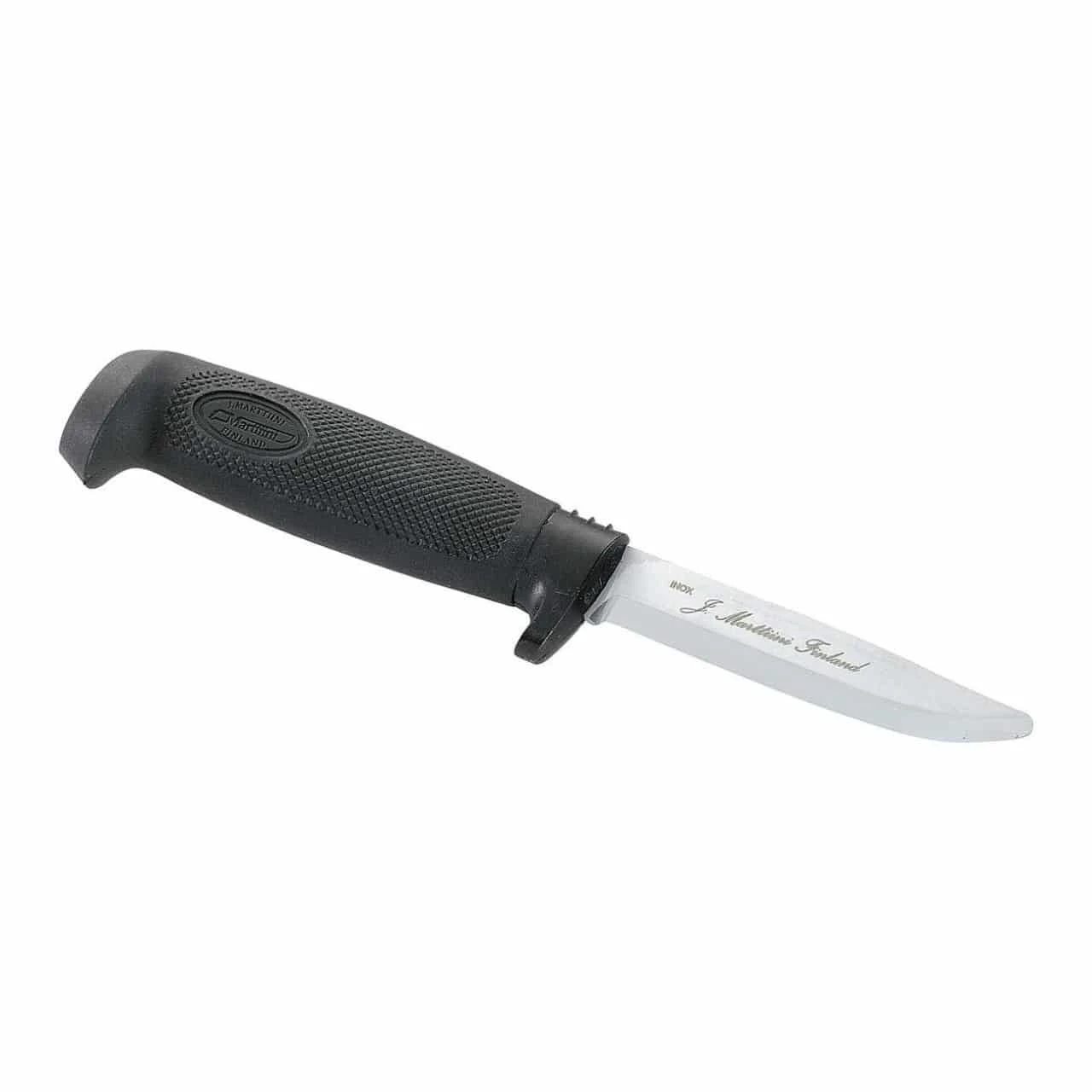 An diesem tollen Messer aus dem Hause Marttiini hat der Junior große Freude. Zur Sicherheit ist die Klingenspitze abgerundet. Der Knebel mit Fingerschutz, die geriffelte Daumenauflage sowie der schwarze Griff aus rutschsicherem Kautschuk bieten hervorragenden Halt. Eine passgenaue schwarze Lederscheide mit Durchstechschutz und Gürtelschlaufe gehört zum Lieferumfang. ACHTUNG! KEIN SPIELZEUG!