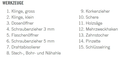 Es gibt die Schweizer Taschenmesser von Victorinox in vielen Ausführungen. Hier hast du eine gute Variante für den Wald, wenn dir auch eine kleine Säge nützen kann. Weiterhin hast du am Huntsman natürlich Klingen, Dosen- und Flaschenöffner, zwei Schraubendreher, einen Haken, Ahle und weitere Funktionen. Insgesamt verfügst du über 15 Werkzeuge.